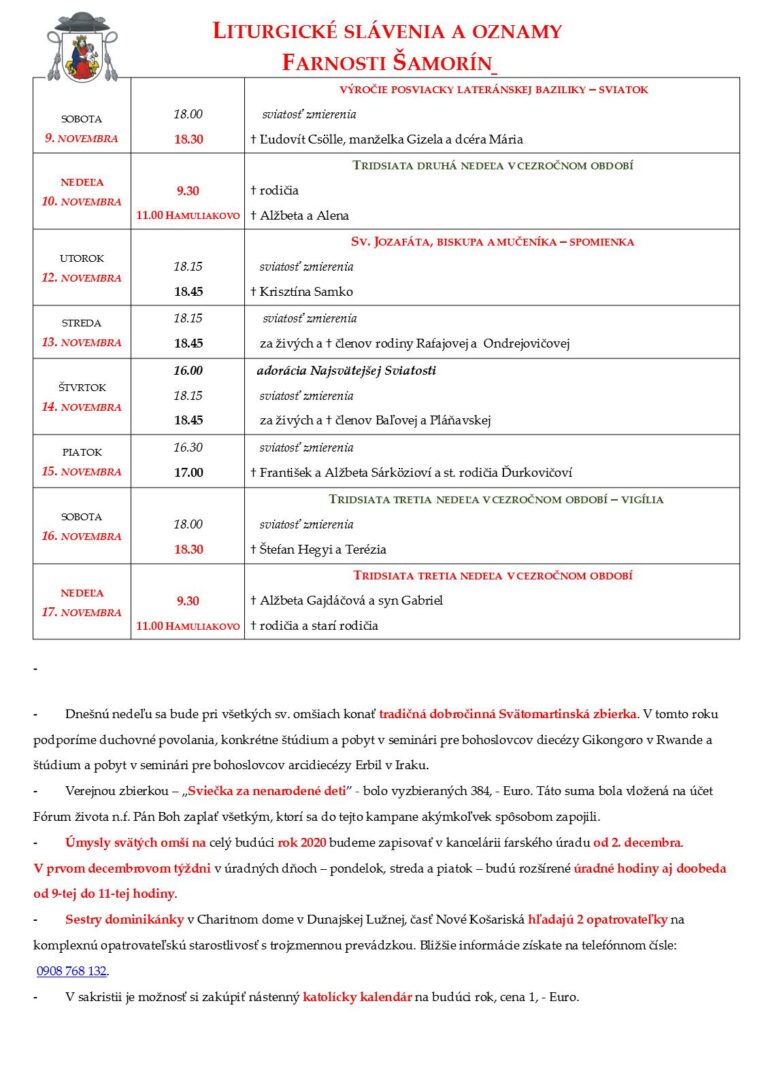- Dnešnú nedeľu sa bude pri všetkých sv. omšiach konať tradičná dobročinná Svätomartinská zbierka. V tomto roku podporíme duchovné povolania, konkrétne štúdium a pobyt v seminári pre bohoslovcov diecézy Gikongoro v Rwande a štúdium a pobyt v seminári pre bohoslovcov arcidiecézy Erbil v Iraku.