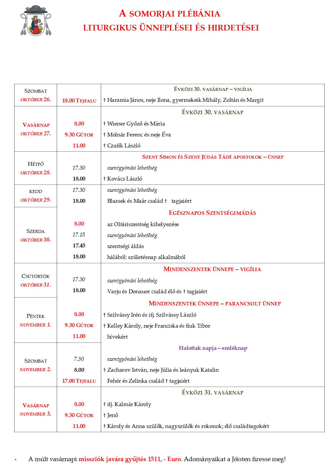 Vasárnap október 27. | 8.009.30 Gútor11.00 | Évközi 30. vasárnap† Wiener Győző és Mária† Molnár Ferenc és neje Éva† Czafik László |